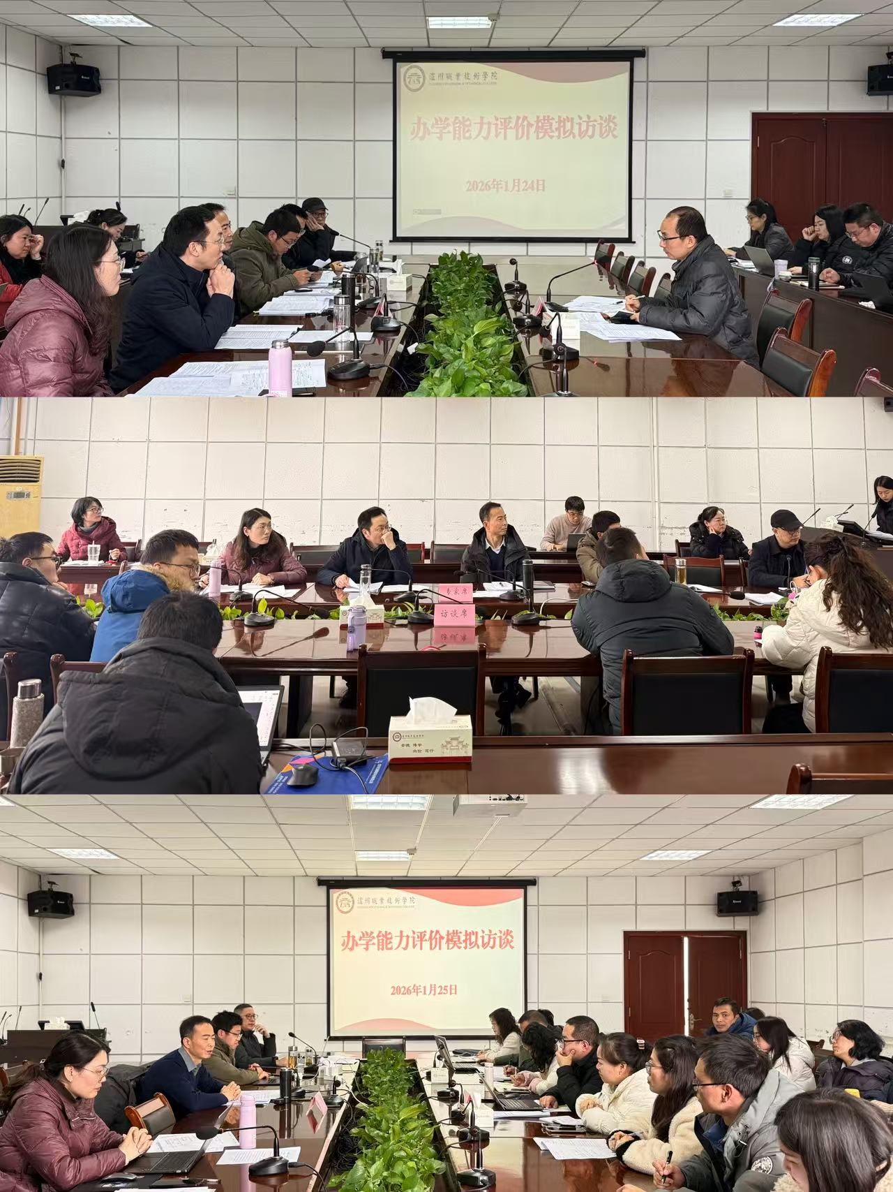 1月24日至25日期间,学校在综合楼415会议室精心组织多场模拟访谈活动。党委常委、副院长梁杰、鲍学东同志全程参与并有力指导。本次模拟访谈严格对标正式评估要求,规范流程、注重实效。校内专家团队围绕专业群建设、实训基地运行、教材开发及师资队伍等关键领域,进行针对性提问,聚焦产教融合校内实训基地载体利用率、校企合作教材开发、虚拟仿真实训应用等核心议题,要求各应答人员以详实数据、典型案例和严密逻辑支撑论述内容。鲍学东副院长在指导中明确要求,专业汇报须突出“产业需求分析-组群逻辑-建设举措-成效特色-改进计划”的闭环逻辑,进一步强化全真实训、能力本位课程开发与双师队伍建设等职业教育特色。